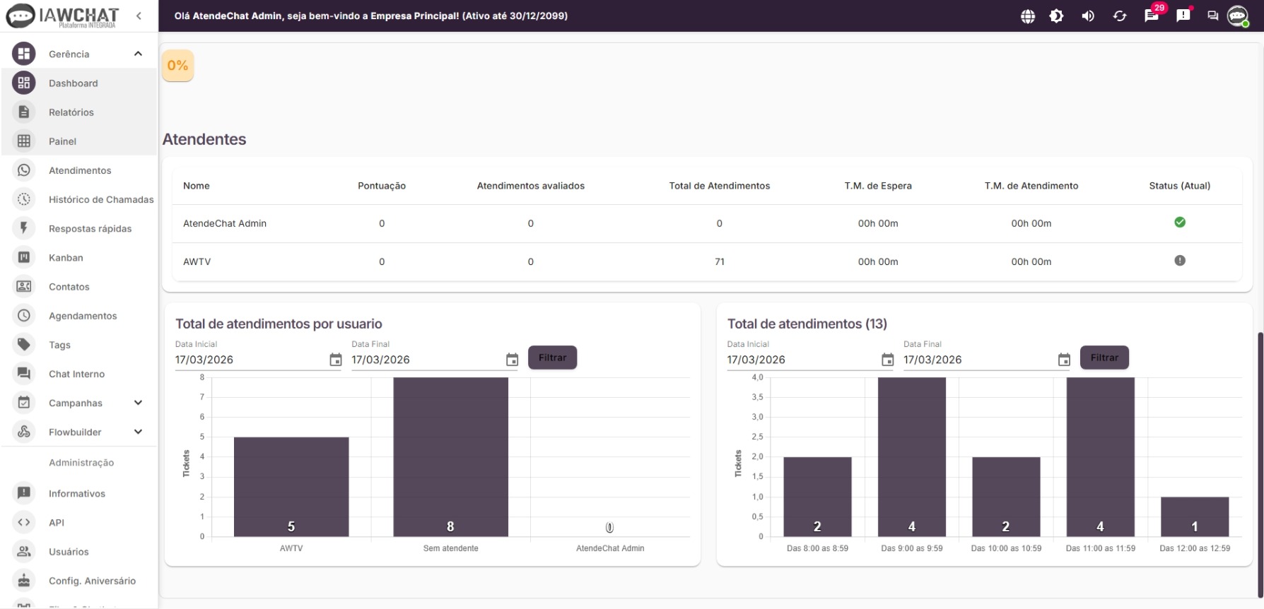 O iAWCHAT transforma um único número de WhatsApp em uma máquina de vendas e suporte. Organização em Kanban, respostas automáticas com IA e relatórios em tempo real.