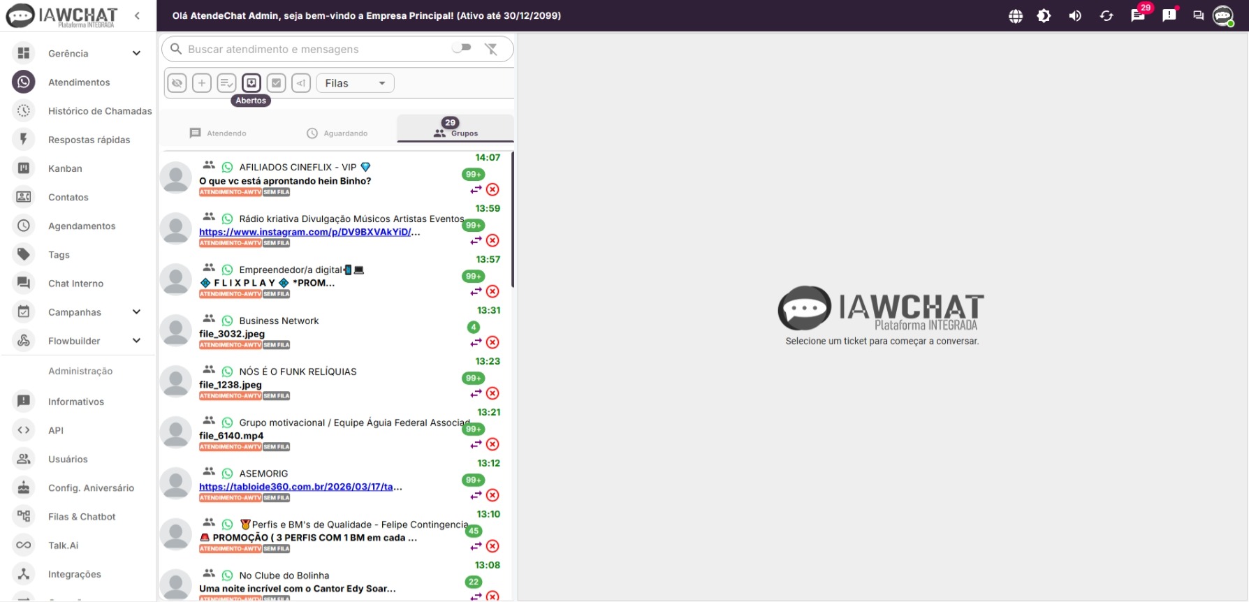 O iAWCHAT transforma um único número de WhatsApp em uma máquina de vendas e suporte. Organização em Kanban, respostas automáticas com IA e relatórios em tempo real.